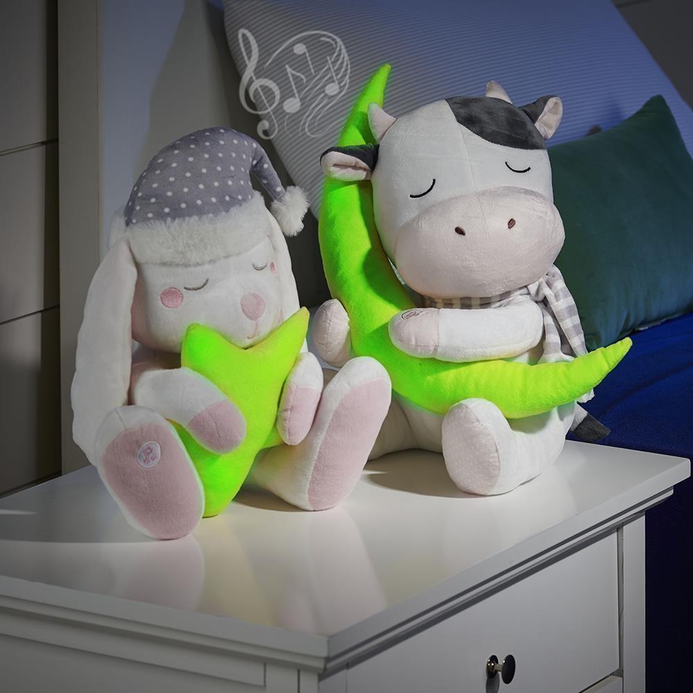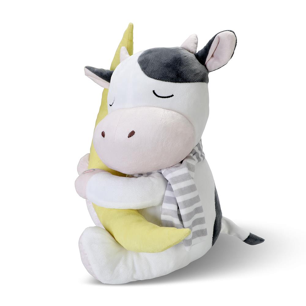 Available only from Hammacher Schlemmer, this is the plush cow that plays a soothing lullaby to help little ones fall asleep. The snuggly stuffed animal holds a glow-in-the-dark star that casts gentle ambient light. The adorable cow’s soft polyester exterior provides a cuddle-worthy feel for an entire childhood of nighttime hugs. Includes three AA batteries. Ages 3 and up. 12" H.