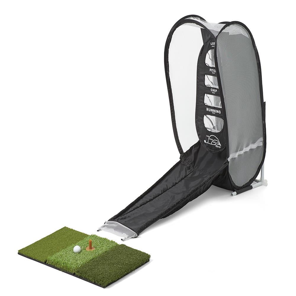 This is the pop-up golf net with four built-in targets that enable you to practice a lob, pitch, chip, or running shot. Similar to an arcade bowling or basketball game, its integrated net captures balls and returns missed shots via an incline for continuous practice or play. For inside or outdoor use, the net is supported with a steel frame and easily assembles/disassembles for compact storage or portability. Includes three golf practice balls, six colored foam balls, and a tri-turf mat. Assembled 48" H x 54 1/4" L x 17 1/4" W. (8 1/2 lbs.)