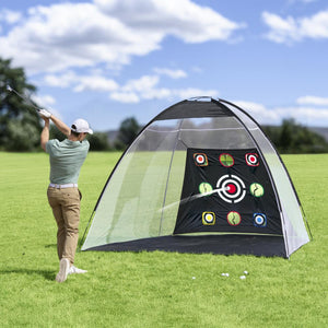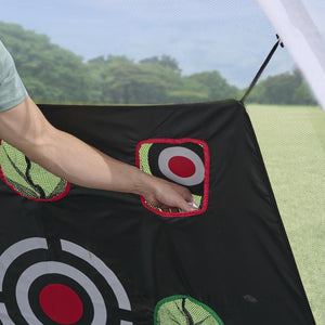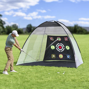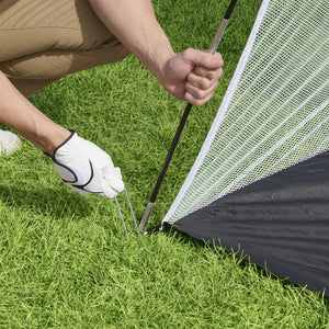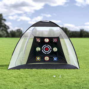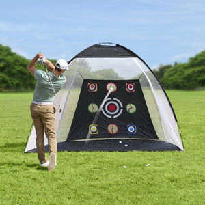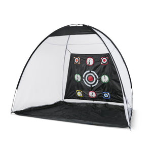 This portable golf practice net transforms any space into a personal driving range. The golf hitting net features nine targets that provide immediate feedback on ball trajectory from "High Draw" to "Low Fade" enabling golfers to perfect their shot-shaping ability. Made from resilient nylon with reinforced impact zones, this golf practice tent withstands golf ball strikes while maintaining structural integrity. The portable driving range sets up within five minutes and folds down just as easily for convenient golf training anywhere. Includes carrying case, rubber tee, dual surface hitting mat, and ground stakes. Open 10' H x 12' W x 8' D.