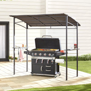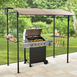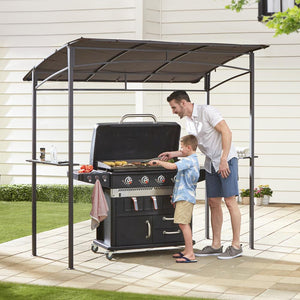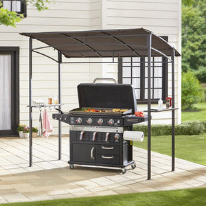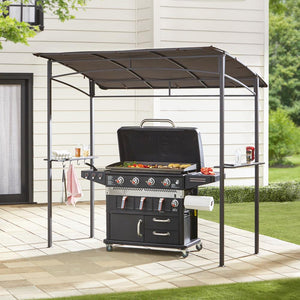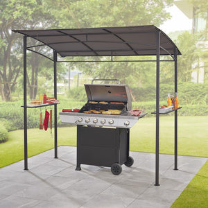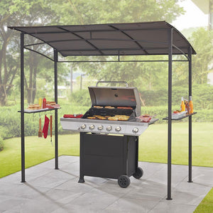 Available exclusively from Hammacher Schlemmer, this is the gazebo that protects an outdoor grill from the sun, rain, and snow as you cook. It’s constructed from all-weather aluminum and steel and has an arched polyester canopy that resists water and has a UPF 30+ rating. A pair of 33" L x 8" W glass shelves on either side of the grillzebo provide surface space for food plates, sauces, and seasonings while five mounted hooks hold grilling tools. Includes ground stakes. Assembly required. Matte Deep Bronze. 85" H x 56" D x 92 1/2" W. (47 lbs.)