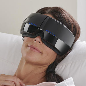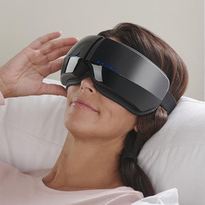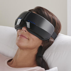 This is the rechargeable eye massager that alleviates stress, tension, and headache pain without the use of medication. The device uses a combination of five massage modes, multi-frequency vibrations (stimulates and soothes tight muscles), air pressure (expands and contracts against different points on the face), and heat compression to stimulate blood flow, relieve eye fatigue, and soothe sore muscles. With built-in speakers for streaming music via Bluetooth and an LED screen that displays current settings and modes. Folds down for travel. With an adjustable belt for a custom fit. 8" H x 4" W x 1 1/2" L.