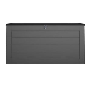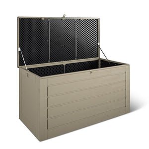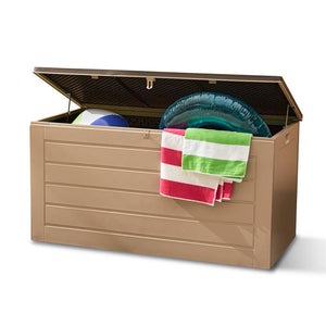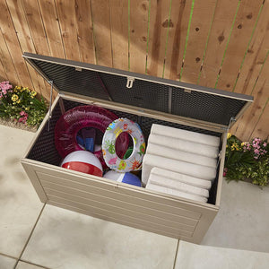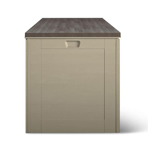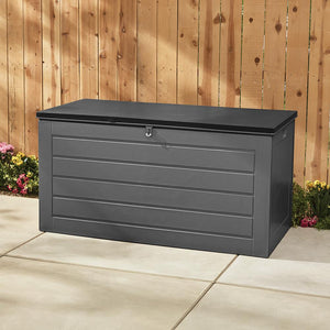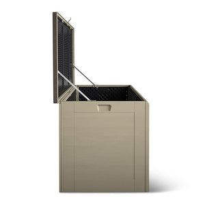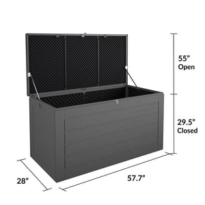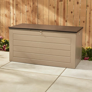 This is the storage box that keeps cushions, pillows, and other deck/patio accessories safe and secure. Made from durable resin, it provides an internal capacity of 180 gallons—large enough to accommodate an entire patio set’s worth of cushions as well as pool toys, hoses, and other backyard gear. Its fade- and water-resistant lid secures closed to protect its contents against wind gusts and animals. With a locking hinge that keeps the lid open when desired. Assembly required. Select Tan or Dark Gray. 57 3/4" W x 28" D x 29 1/2" H. (32 lbs.)