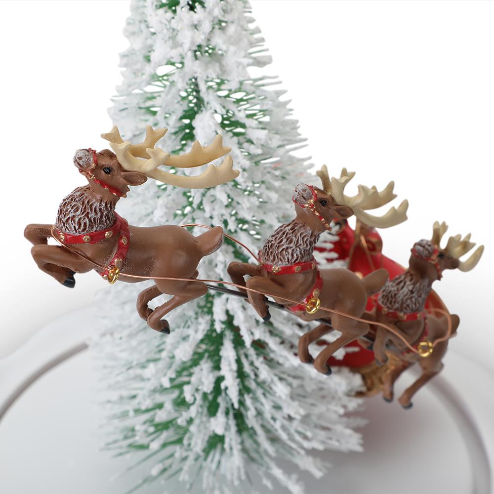 This is the tabletop decoration that portrays Santa and his reindeer taking off for his long ride on Christmas Eve. It is handmade from ceramic and handpainted in colors that evoke the classic Christmases of yesteryear with a snowy landscapes. The sleigh rotates around the tree while "taking off". AC plug. 9" H x 8 1/2" W x 8 1/2" D.