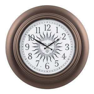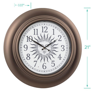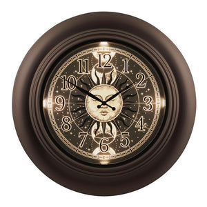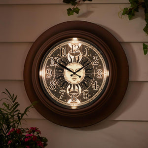 This is the illuminated clock that displays a sun face during the day and a mesmerizing moon face at night. Its large numbers and metal hands are visible up to 25' away and the clock’s weather-resistant construction enables it to withstand damage from water and UV-light. When dusk approaches, its built-in sensor detects darkness and illuminates the clock’s face with LED backlighting, bringing the enchanting nighttime face to life. With a six-hour timer that automatically turns the light off to conserve battery life. Requires four D batteries and one AA battery. 21" Diameter x 2 3/4" D. (7 1/2 lbs.)