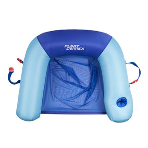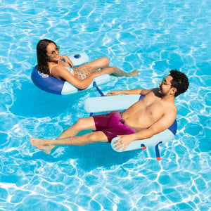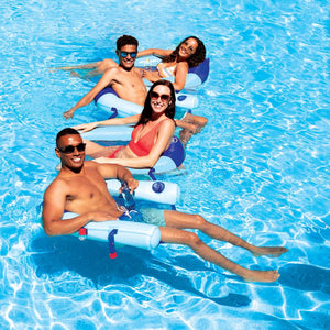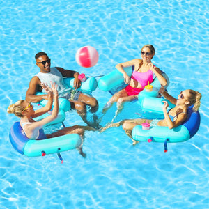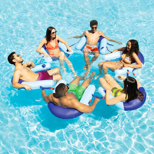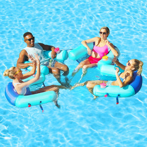 This is the set of four inflatable pool floats that connect to one another for socializing while lounging. Each float supports up to 300 lbs. and is made with thick PVC backs and armrests and a mesh sling seat. They inflate/deflate within minutes manually or using your preferred pump. Each floating chair also has a built-in cup holder. Ages 8 and up. Each float (inflated) 37' L x 29' W x 9' H. Set of Four.