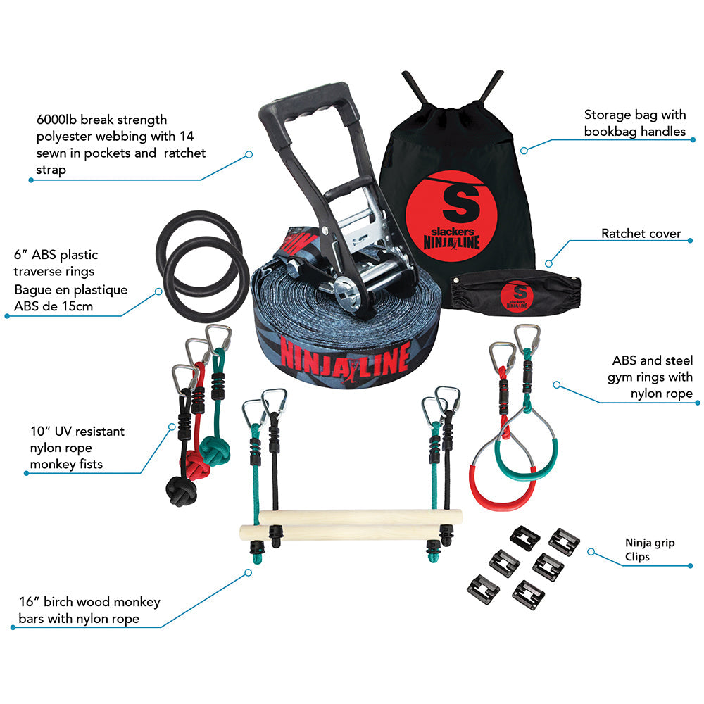 Available only from Hammacher Schlemmer, this is the 50' obstacle course that gives up-and-coming ninjas an easy, safe, and fun way to emulate the competitive ninja athletes seen on TV. The course is as fast to set up as a ninja’s reflexes. The 2" wide nylon ninja line is strung 7 1/2' off the ground between two trees or posts and the seven obstacles hang anywhere along its 50' length from sturdy steel carabiners. As young ninjas navigate the course, they build core and upper body strength, coordination, and confidence—all while spending more time in active, outdoor play. Includes three 10" “ninja fist” rope grips, two 16" monkey bars, climbing rope with footholds, spinning wheel, and two gymnastic rings. Can also be used as a slack line. Supports up to 250 lbs. Includes carrying bag. Ages 5 and up. Box: 17" L x 14" W x 12 1/2" D. (15 lbs.)