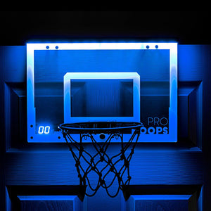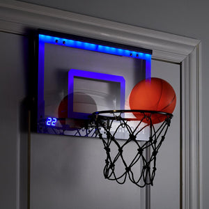 This is the over-the-door basketball hoop with built-in LEDs and a shatterproof backboard score display that tracks shots made with an infrared sensor. Made from polycarbonate, the backboard resists the impact of vigorous slam dunks while the 91/2" metal rim has a durable eight-loop net that provides an optimal target for long shots. A sensor built into the backboard just below the back of the rim detects shots—without the interference of common paddle-based sensors—and automatically registers points on a two-digit LED display on the backboard’s left corner with accompanying sound (which can be turned off). Fits over most doors and includes a 3/4" strip of EVA foam to protect any door onto which it is installed. Includes ball and hand pump. Requires three AAA batteries. 12" H x 173/4" W.