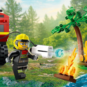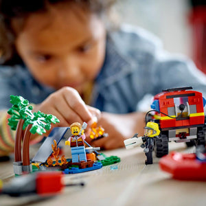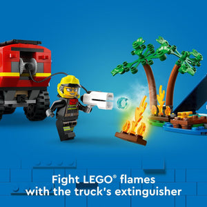 This is the LEGO® City set that lets budding first responders battle imaginary blazes and come to the rescue of an endangered campground. The 301-piece set features a 4x4 fire truck that tows a rescue dinghy and includes a working fire extinguisher that knocks out the LEGO® flames. The set also builds a camping scene with a toy tent and campfire. Includes one camper and two firefighter minifigures. Ages 5 and up. Fire truck measures 3" H x 2 1/2" W x 11 1/2" L.