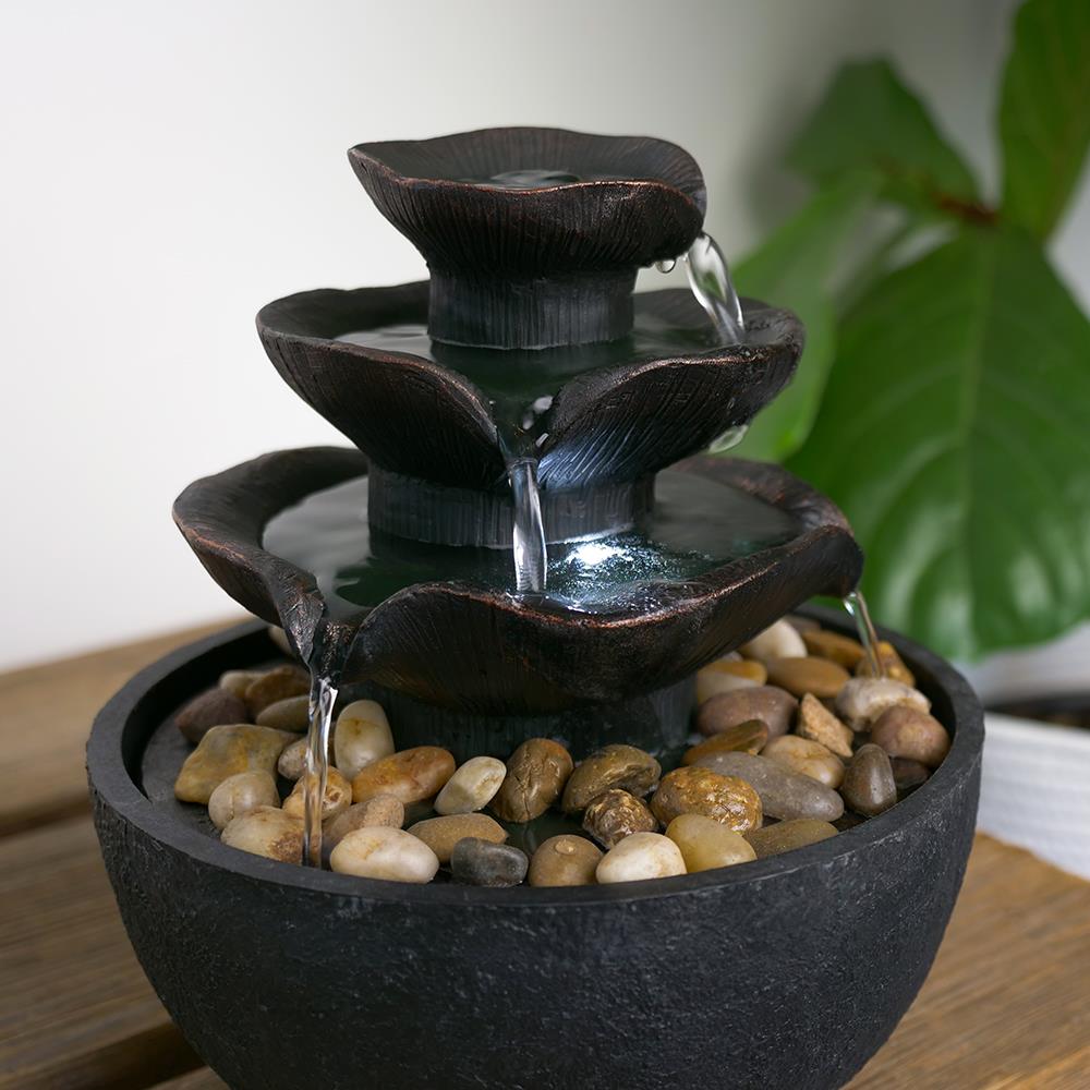 This is the indoor tabletop fountain that provides endless peace and serenity. An internal pump continuously recirculates water through the four-tiered resin fountain to generate the tranquil sounds of trickling water. A single LED provides soft white illumination that further enhances the feeling of peace and harmony. Includes decorative rocks. AC plug. 8" Diam. x 8 1/2" H. (4 lbs.)