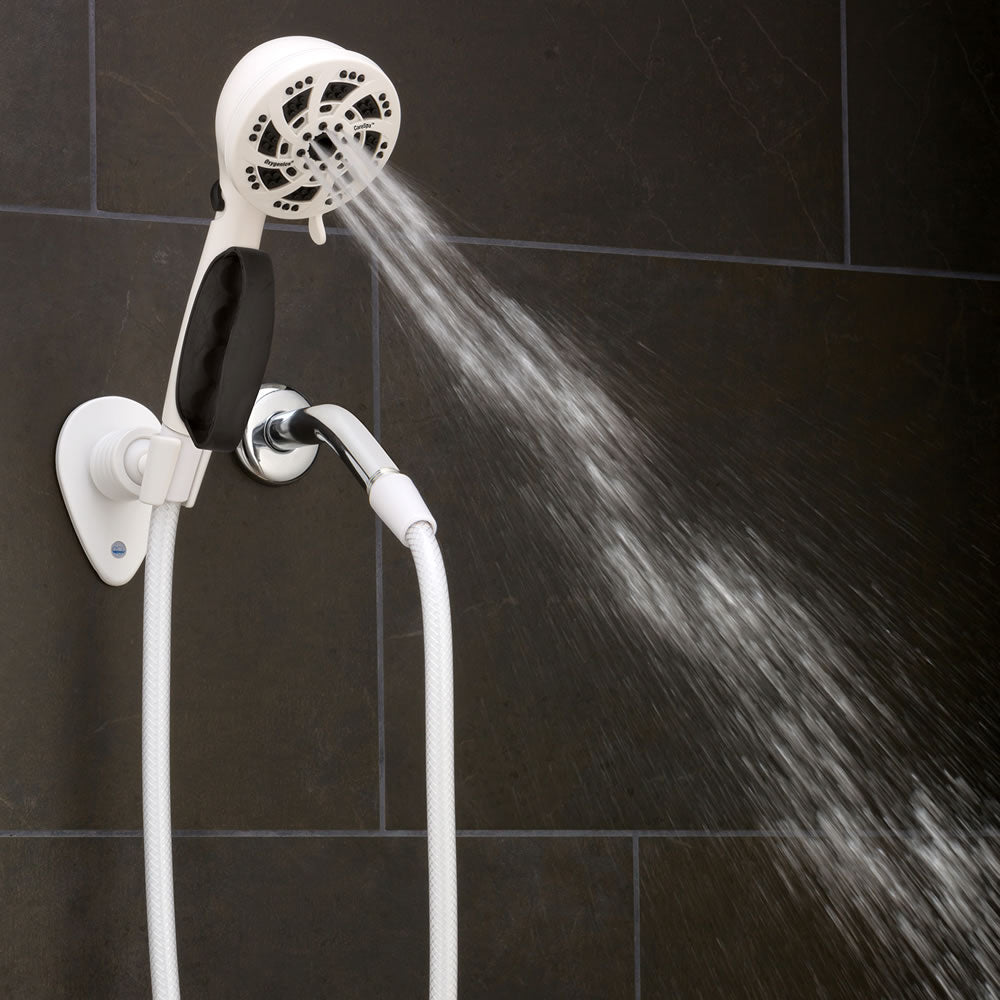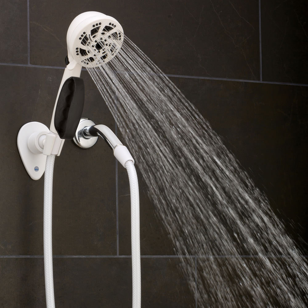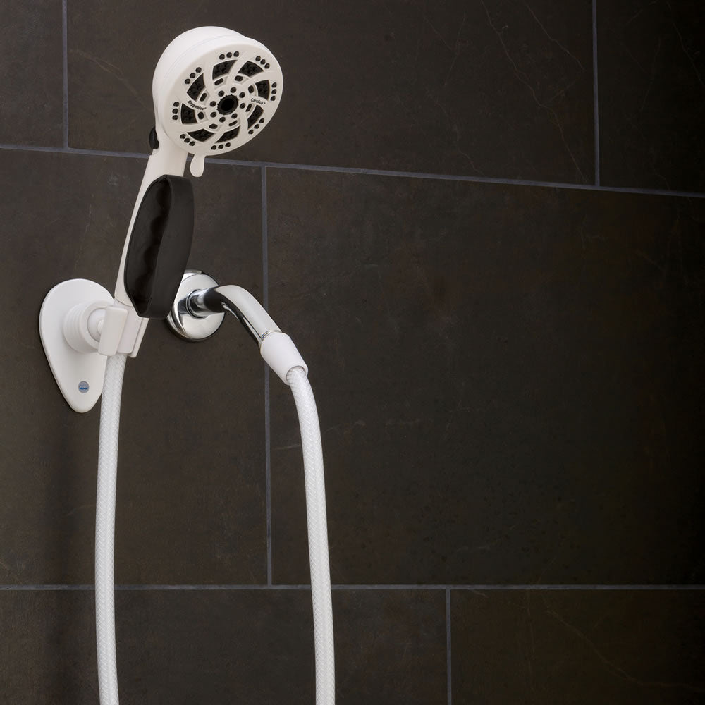 This handheld showerhead has a 96"-long hose that lets you reach and rinse every part of your body with ease. Unlike static showerheads that remain fixed on a wall, this unit attaches to an existing shower arm and provides handheld control of water jet angle and pressure. An included wall mount secures without any tools via adhesive tape and holds the 81-jet showerhead at your preferred height. With five stream settings, a non-slip rubber grip, and three pressure settings up to 80 PSI. White. 9 1/4" L x 3 3/4" W x 2 3/4" D. (2 lbs.)