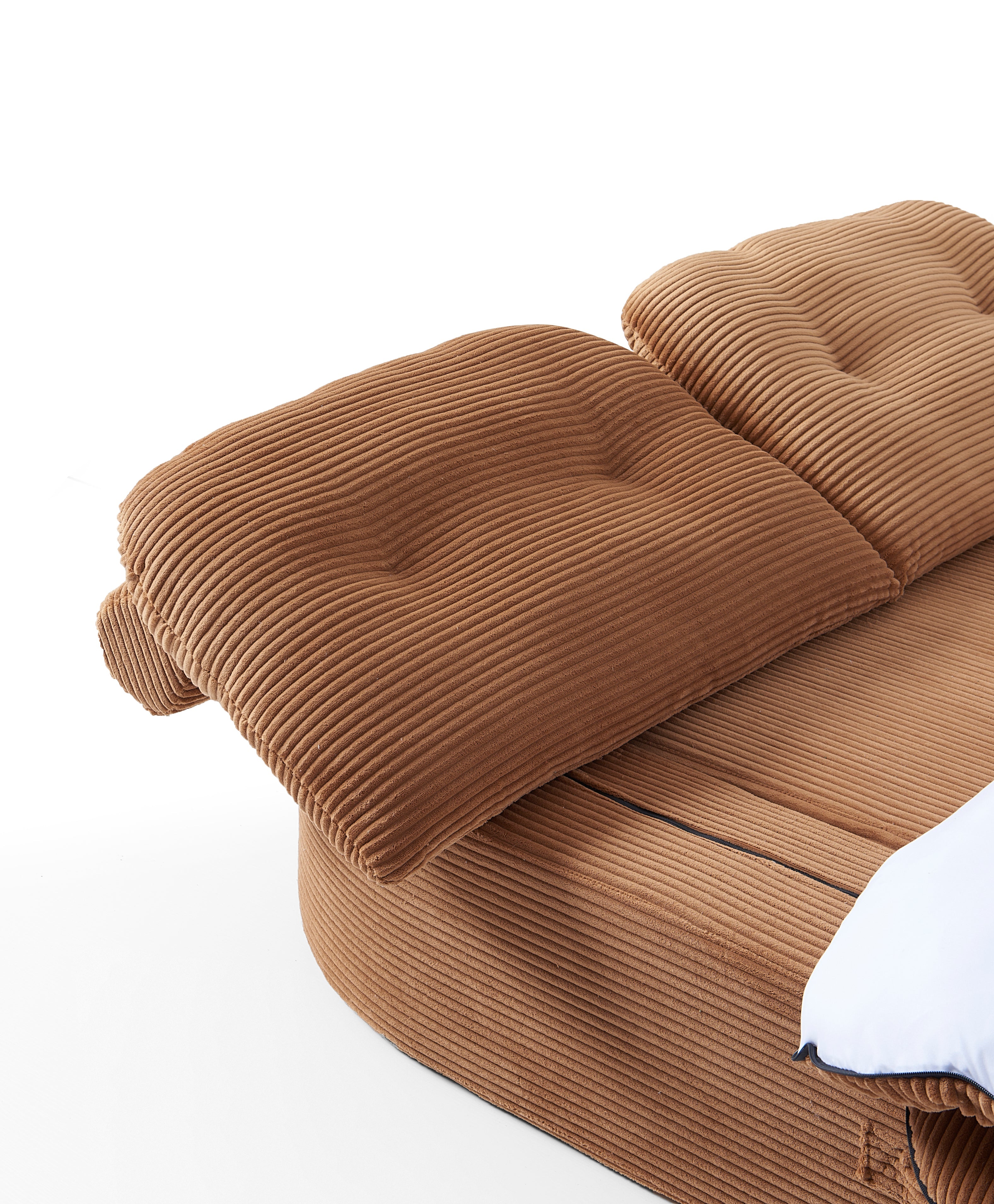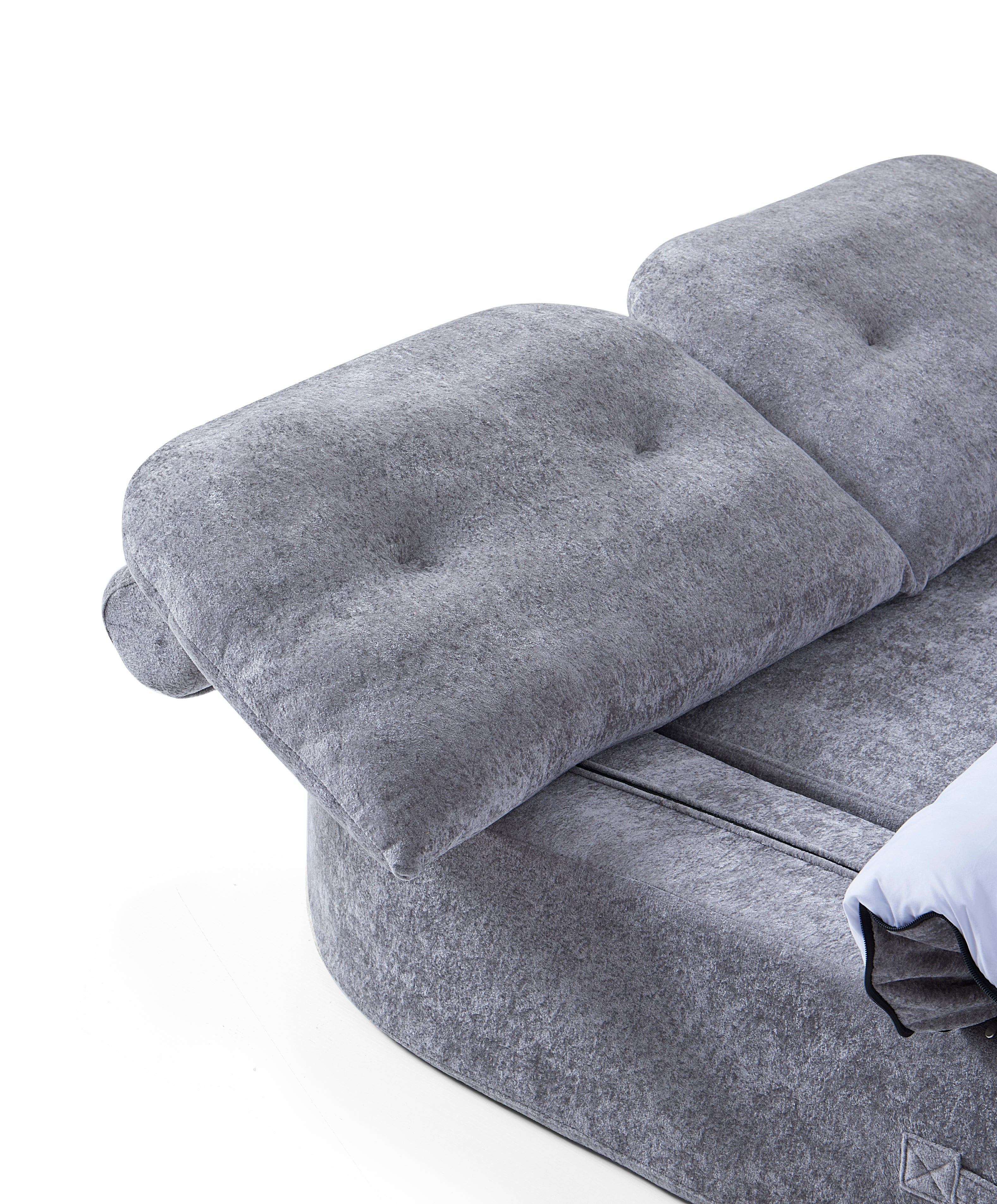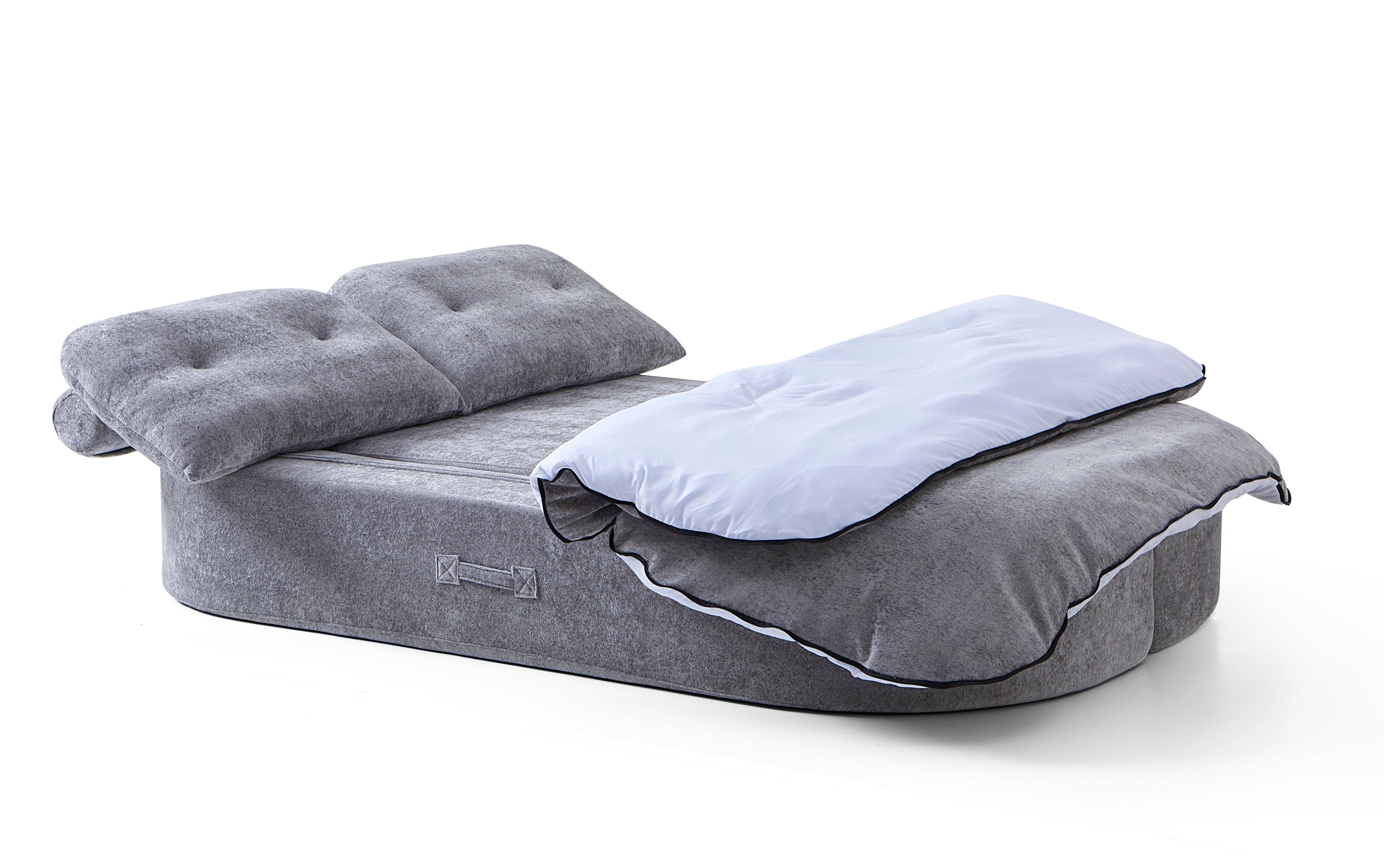 Loop's clever design features a flip-down backrest that transforms into an extended bed space—perfect for guests or lazy Sundays. But the real surprise? The seat cushion doubles as a plush blanket. Unzip it to reveal a fluffy. full-size cover to snuggle into. then zip it back up when it's time to lounge again.
