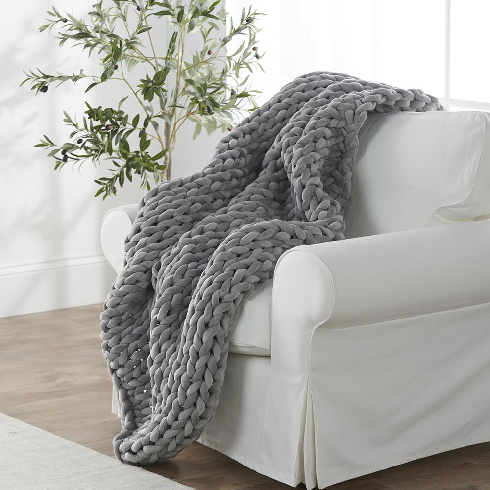 This is the hand knit weighted blanket that helps alleviate stress through gentle, even pressure just like a hug. Unlike traditional weighted textiles that are filled with micro glass beads, this model is woven with chunky polyester-filled threads that provide a more balanced distribution of weight while remaining soft and breathable. The heaviness of the blanket helps produce a soothing and calming sensation, similar to being swaddled to help you feel secure and relaxed. 100% Polyester. Handwash or spot clean. Imported. Grey. 50" L x 60" W. (10 lbs.)