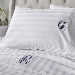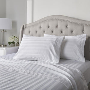 These are the luxuriously soft bed sheets similar to those found in 5-star resorts and hotels. The 300-thread count cotton/polyester blended sheets are woven on a special dobby loom, yielding a refined texture superior to those of common sheet sets. The sheets are wrinkle resistant and have been certified by Oeko-Tex 100—an international organization that tests textiles for harmful chemicals and substances. Set includes a flat sheet, a fitted sheet that fits mattresses up to 13"-deep, and two pillowcases with enveloping pockets. White. King Sheet Set.