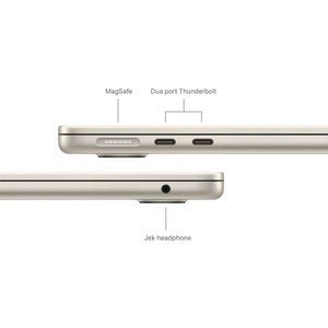 • TERHUBUNG — MacBook Air dilengkapi dua port Thunderbolt, jek headphone, Wi-Fi 6E, 4 Bluetooth 5.3, dan port pengisian daya MagSafe. Dan terhubung ke hingga dua layar eksternal dengan layar laptop tertutup.
