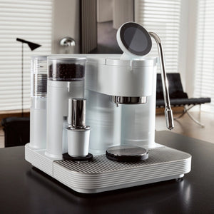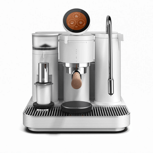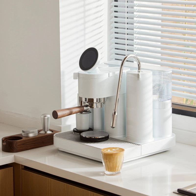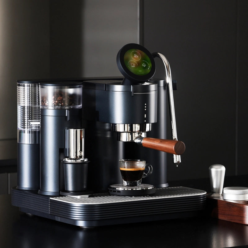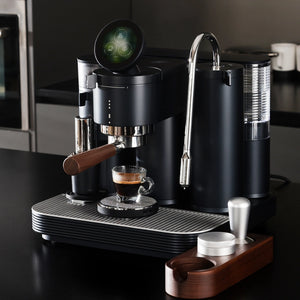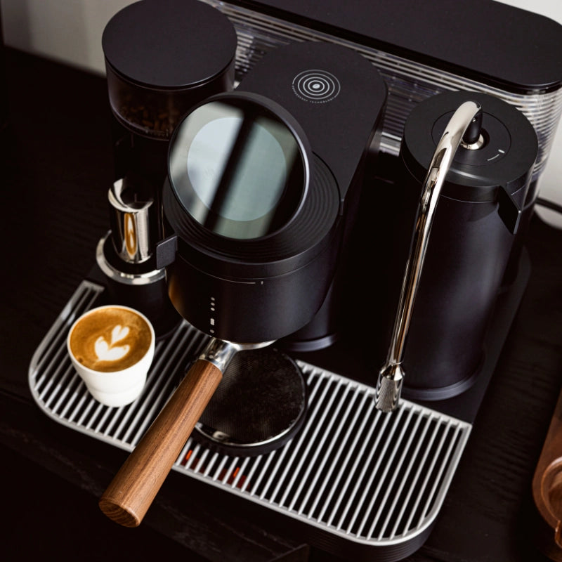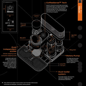 Elevate your coffee experience with the Meraki Espresso Machine, designed for home baristas and coffee enthusiasts. Featuring a dual boiler design for optimal temperature stability, a heated stainless steel group head, and a 360° steam wand for effortless milk frothing. Its powerful yet quiet rotary pump ensures consistent pressure, while the TIMEMORE® co-engineered grinder with Ion Beam Static-Free Grinding delivers precise and mess-free coffee preparation. The magnetic dosing cup ensures smooth and accurate dosing.