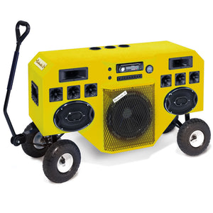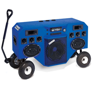 This is the portable stereo system that optimizes the 30 year-old concept of the portable audio player by blasting your music at backyard or tailgate parties. Built onto a steel chassis that rolls on four 10"-diam. pneumatic tires over any terrain, including sand and snow, it is pulled along and steered with an integrated wagon handle. Providing over 2,000 watts of sonorous symphony with eight PA-quality Piezo horn tweeters, two "6x9" mid-range speakers, and a 12" dual-voice coil subwoofer with dedicated crossover, it plays music from any Bluetooth-enabled smartphone or MP3 player from up to 30' away. Its CD player, AM/FM radio, USB port, and 3.5mm input provide additional play options, controlled with an included remote. Dedicated amplifiers installed into the MDF cabinet's vented rear drive the subwoofer and other speakers separately while its four-band equalizer provides precise control for optimal audio performance. Includes three recessed drink holders, radio antenna, bottle opener, and flagpole mount. A 12-volt 34AGM deep-cycle marine battery (required) provides up to 20 hours of audio at 50% volume from a full charge using the included AC charger. 48" L x 28 1/2" H x 21 1/2" D. (217 lbs.)
