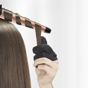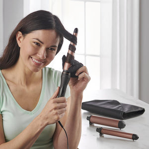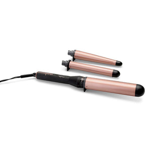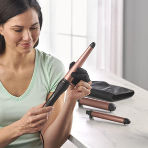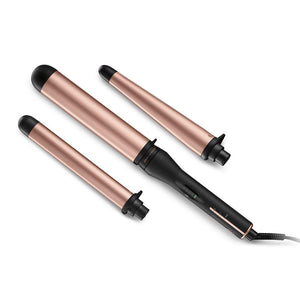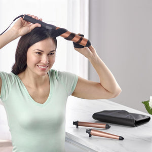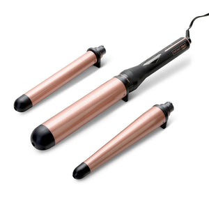 This is the curling wand that produces a variety of hairstyles via three interchangeable barrels. It comes with a 1"-diameter straight barrel that generates classic waves, a 1 1/2" straight barrel for glamour waves, and a 1 1/4"-1 3/4" tapered barrel that makes beachy waves. Each of the barrels are made with rose gold tourmaline ceramic that releases negatively charged natural ions that help smooth hair cuticles, leaving hair silky and shiny and preventing frizz and static. The wand heats up in only 30 seconds, has five temperatures settings up to 400º F, and features an ergonomic slim handle. AC plug with 6'-long cord. 14 1/2" L. (10 oz.)