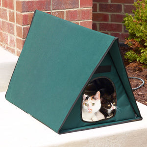 This is the only outdoor cat shelter with a heated bed that keeps up to four felines warm and comfy in cool temperatures. The 1 1/2"-tick soft foam bed has an integrated heater that generates radiant warmth that comforts outdoor cats. Its A-frame design, durable 600-denier nylon exterior with a waterproof vinyl backing, and roof overhang help keep felines dry during rain showers. Dual exits allow cats to come and go with ease and as they please. Assembles easily without tools. Plugs into AC with a 5 1/2' cord. 35" L x 20 1/2" W x 20" D. (9 1/4 lbs.)