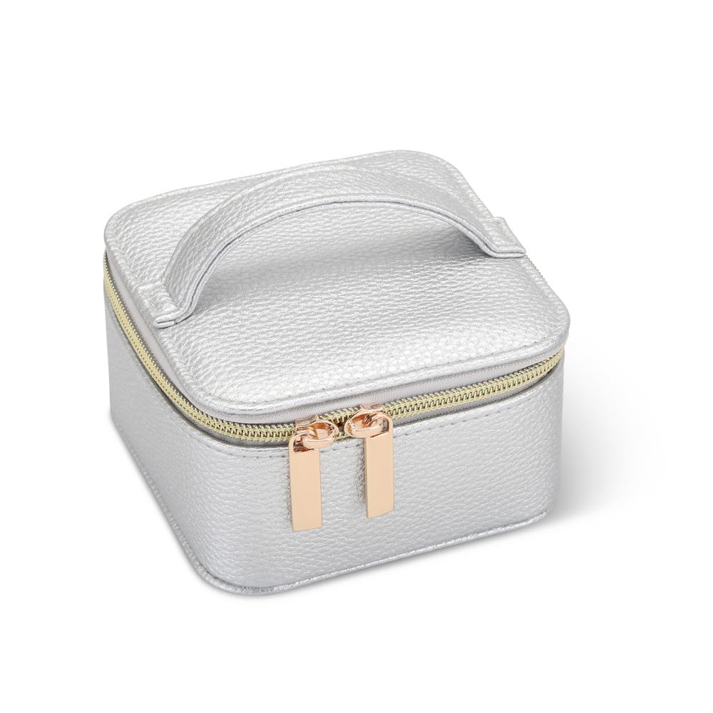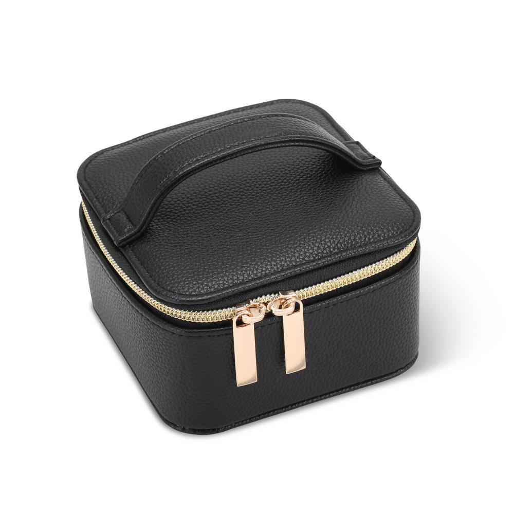 This is the travel-sized jewelry case that keeps earrings, necklaces, rings, and other valuables neatly stored and secure. Its zipper closure opens to reveal a removable insert that contains four zippered pouches, ideal for watches, bracelets, or necklaces. The inside top of the case provides an earring tree that accommodates five pairs of earrings and a ring holder that secures up to eight rings. The vegan leather travel case can be slipped into any carry-on or packed with confidence inside checked luggage. Select Pale Pink, Silver, or Black. 5" L x 5" W x 4" H. (8 oz.)