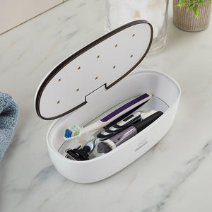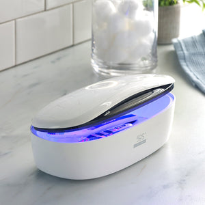 This is the sanitizing chamber that sanitizes personal items in under 3 minutes using safe UV-C light. Using the same technology trusted to sterilize hospital instruments, it disinfects eyeglasses, tweezers, make-up brushes, personal razors, jewelry, and other small essentials including electronic devices. Its 10 LEDs generate 260-280nm wavelength UV-C light that destroys viral and bacterial cell membranes, rendering the microorganisms incapable of reproduction and survival. LEDs rated for 10,000 hours. AC plug. 91/4" L x 41/4" W x 3" D. (14 oz.)