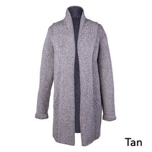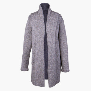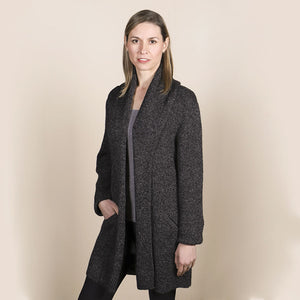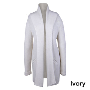 This alpaca topper hails from Peru, where the wool is hand-shorn once a year from the indigenous camelid of the Andes. Warmer than cashmere and every bit as soft, alpaca is one of the most sought-after natural fibers in the world for its durability, softness, and silky touch. And with an incredibly fine fiber, the resulting sweater possesses a smoother, less-itchy finish than coarser sheep or goat wool. Knitted by skilled craftsmen in Lima, the alpaca is blended with 30% acrylic to create a topper that is the perfect complement to leggings, jeans, or dresses, with a contemporary open shawl collar and two deep front pockets. Stylish yet long-wearing, the garment resists stretching and wrinkling. Hand wash or dry clean. Ivory, Tan, or Charcoal. One size fits most.