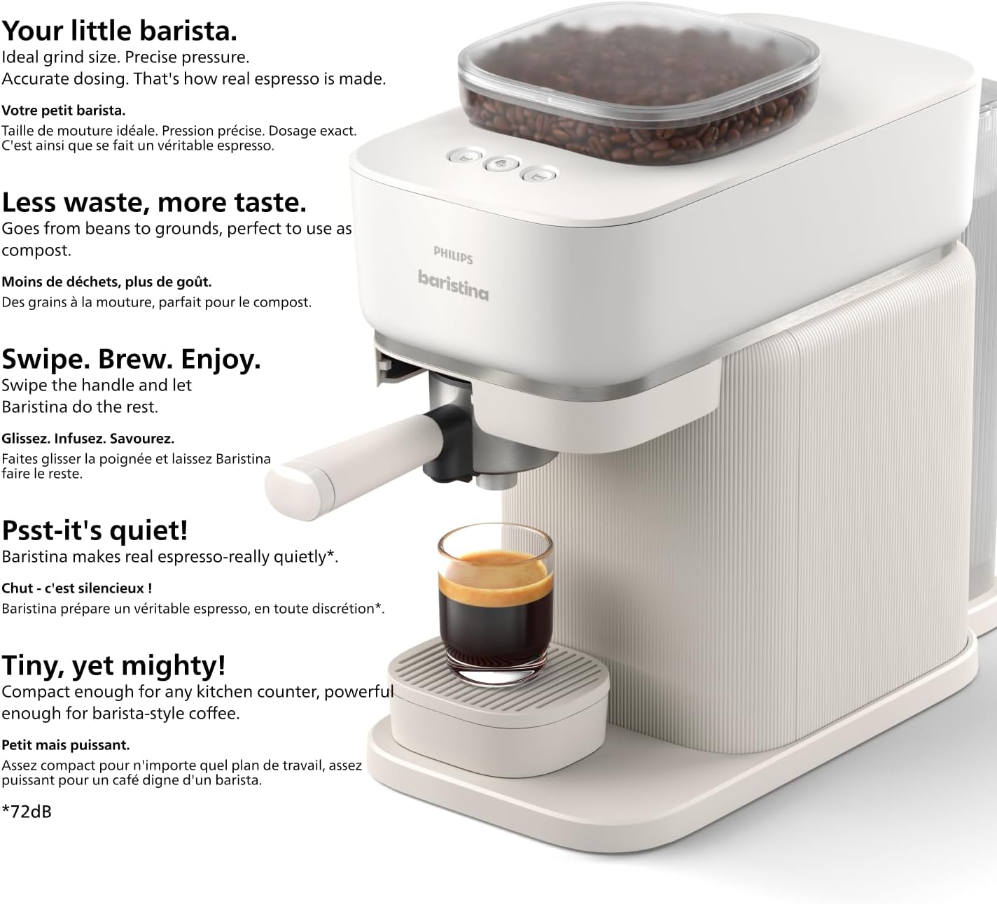 - SWIPE. BREW. ENJOY: Swipe the handle and let Baristina do the rest. Coming from bean to cup all in less than 60 seconds.