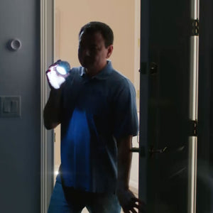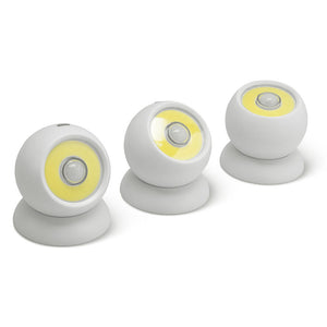 These are the motion activated cordless lights that secure to any surface, rotate in multiple directions, and remove from their mounts to use as flashlights. Without requiring proximity to an outlet, the battery-powered lights have an integrated motion detector that senses movement from up to 16' away. Ideal for indoor or outdoor use, they mount to various surfaces via magnetic backing or the included peel and stick adhesive. Each light has two brightness levels up to 200 lumens and a strobe feature. LEDs rated for 60,000 hours. Each light requires three AAA batteries. Set of three.