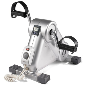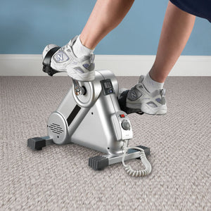 This exercise pedaler provides a power-assisted leg workout for individuals with limited mobility to help improve muscular strength and coordination. Just a 15-minute workout helps improve muscle strength and range of motion and can be performed while watching TV. The device runs smoothly using a whisper-quiet 18-watt motor that coaxes your legs to cycle without forceful, jerky movement. Pedaling speed begins at a calm 25 RPM, and the included remote allows you to increase your speed incrementally up to a robust 65 rpm. It has an easy-to-read LCD that displays your distance, time, calories burned, and rpm. Sturdy ABS/resin/steel construction. Plugs into AC; LCD includes watch battery. 14" H x 13" W x 16" D. (13 1/4 lbs.)