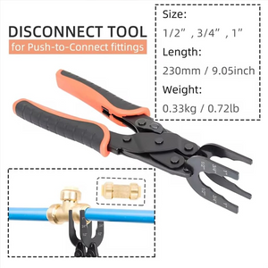 INTEGRATED MULTI-SIZE DESIGN – The model ingeniously combines 1/2-in, 3/4-in, and 1-in tongs into a single, compact tool. This design not only simplifies the task but also ensures effective removal of brass push-to-connect fittings from pipes, enhancing efficiency and reducing the need for multiple tools.