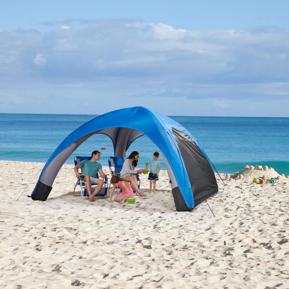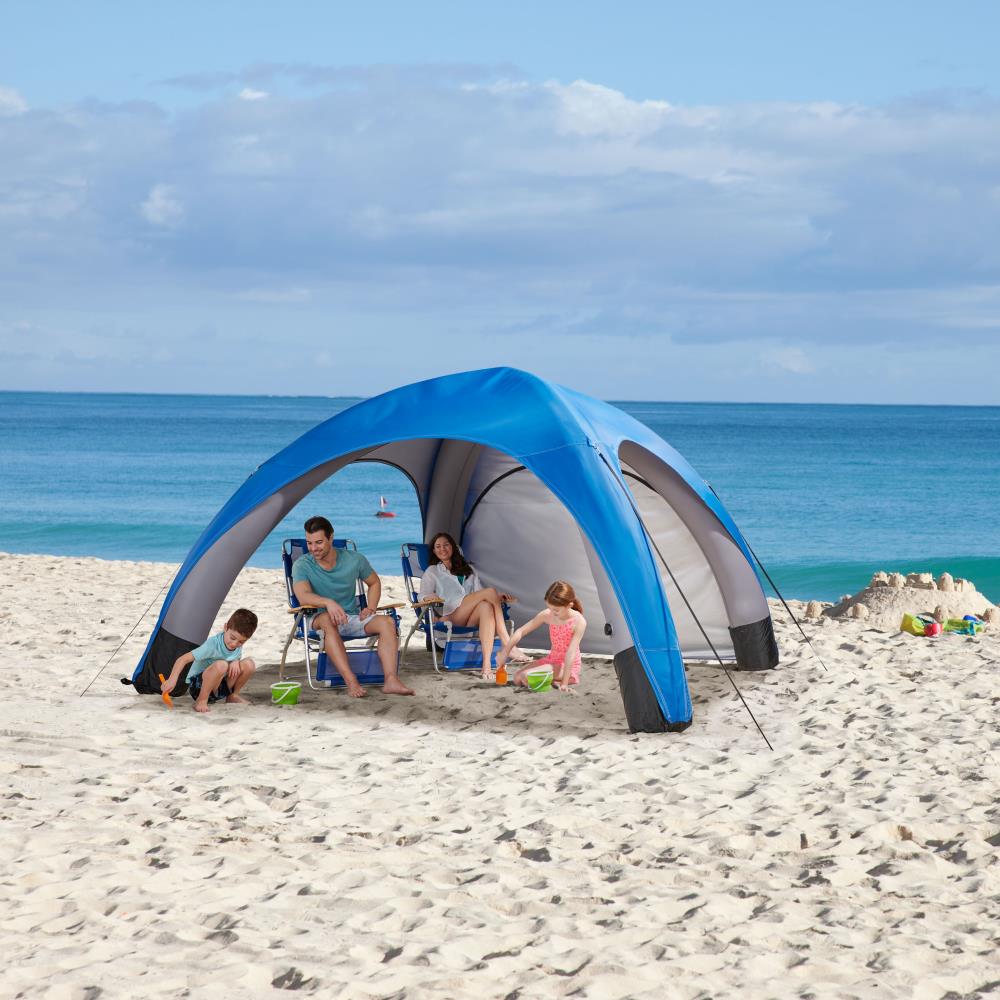 This is the inflatable canopy that sets up within minutes for quick and easy enjoyment when picnicking, camping, or at the beach. Made from durable and water-resistant polyester fabric, it blocks 98% of the sun’s UV rays with UPF 50+ protection. The inflated sunshade provides enough capacity to comfortably accommodate eight adults and it comes with an attachable zippered wall to provide additional sun, wind, or rain protection. It inflates in two minutes using the included rechargeable air pump and secures to the ground with eight stakes and four rope tethers. When not in use, the sunshade easily deflates and fits into the included backpack. Air pump charges via USB. Blue. Open 10' L x 10' W x 7' H. (17 lbs.)