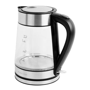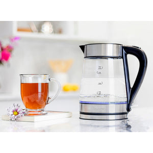 This is the electric tea kettle that uses patented Strix technology to boil water 20% faster than any traditional or electric kettle available. The leading thermostatic control used in electric kettles worldwide, Strix is used in nearly all 32 million kettles known to exist in the United Kingdom, sought for its precise detection of temperature for a safe cut-off of power when water has reached an ideal boiling temperature for beverages. With a 1,750-watt rapid boil element, this 57-oz. capacity kettle has glass sides that enables you to see the water level and is trimmed with stainless steel trim and capped by a locking satefey lid. A blue LED ring in the bottom indicates on/off. Comes with a removeable filter, auto on/off switch, and built-in dry-boil protection. AC plug. 7 1/4"-Diam.