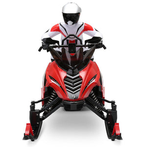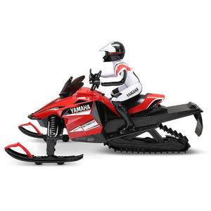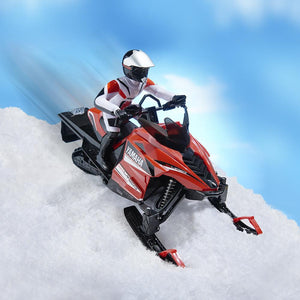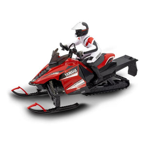 This is the remote controlled 1:6 scale Yamaha snowmobile that traverses over snowdrifts, dirt, and grass. It has built-in suspension, working lights, and interchangeable skis that enable it to conquer various terrains like an extreme racer. It's operated by a 2.4 GHz radio-frequency remote that moves the vehicle forward, backward, left, and right from up to 114' away. Snowmobile charges via USB; a full charge provides up to 20 minutes of operation. Includes removable rider and a 9-volt battery for remote. Ages 8 and up. 11" H x 19" W x 8 1/2" D.