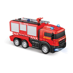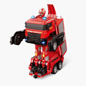 These are the shape-shifting toys that convert from a powerful RC vehicle to a burly robot at the press of a button. Human drivers steer the vehicle from up to 25' away indoors or outdoors, whizzing forward and backward and drifting into turns. Then, with a press of the transform button, the car rises up, its passenger or cabinet doors change into arms, and its frame becomes the imposing torso of a menacing robot. Each vehicle has flashing LEDs and the firetruck and excavator play music that can be switched off. Lithium-ion battery recharges via USB; remote requires two AA batteries. Ages 6 and up.Firetruck. 3 3/4" H x 10" W x 5 1/2" D.