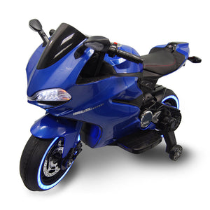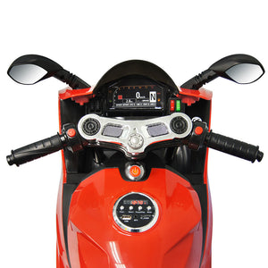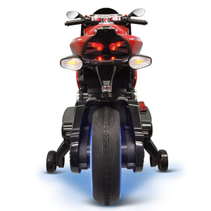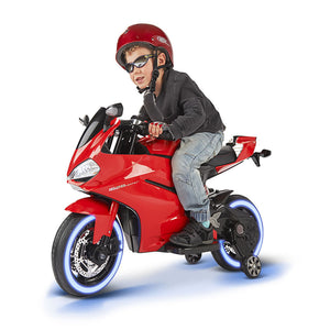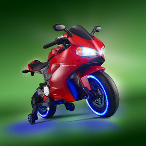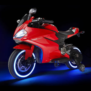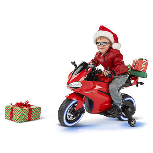 This is the children’s hot rod motorcycle that carries a rebellious toddler across patios and cruising down sidewalks. A built-in rechargeable battery powers its 12-volt electric motor as controls on the dashboard enable a child to choose a speed (2mph or 4mph), select forward/reverse operation, and illuminate the headlights, taillights, and wheels via integrated LEDs. Supporting a single rider up to 65 lbs., the motorcycle has an integrated spring suspension that minimizes vibration for a smooth ride and removable stabilizer wheels that help young riders maintain balance. It generates realistic engine and horn sounds and has built-in speakers that play music from a smartphone via an SD memory card, USB drive, or an included auxiliary cable. A four-hour charge via AC provides up to 90 minutes of power. Red. Ages 2 to 5. 17" H x 40" L x 24 1/2" W. (44 lbs.)