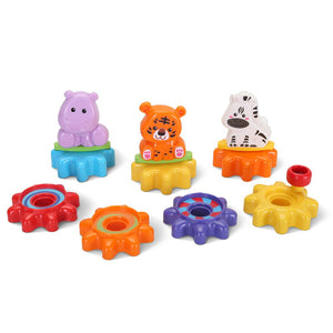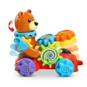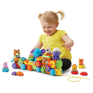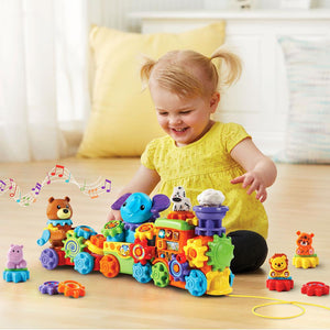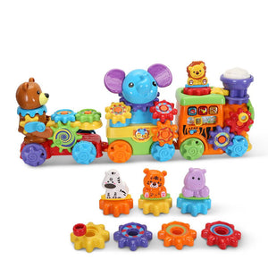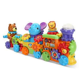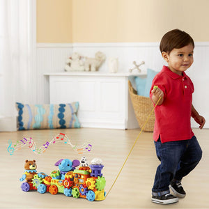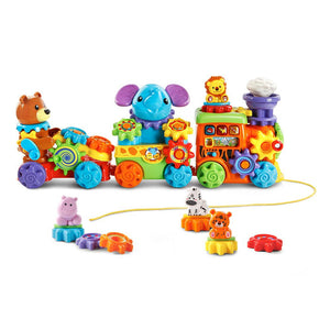 This is the interactive pull train that helps teach toddlers instruments, colors, and animals, while developing fine motor skills. The locomotive contains light-up buttons that play music and make instrument sounds as well as a front pull string for journeys around the house. The middle car and caboose display an elephant and bear, respectively that also make animal noises. Each one of the three cars attach and detach from one another and have 15 interchangeable gears that allow little ones to make their own custom train while exploring colors, sounds, and cause and effect actions. Includes two AA batteries. Ages 11/2-4 years. 21 1/4" L x 4 3/4" W x 9 1/2" H. (3 lbs.)