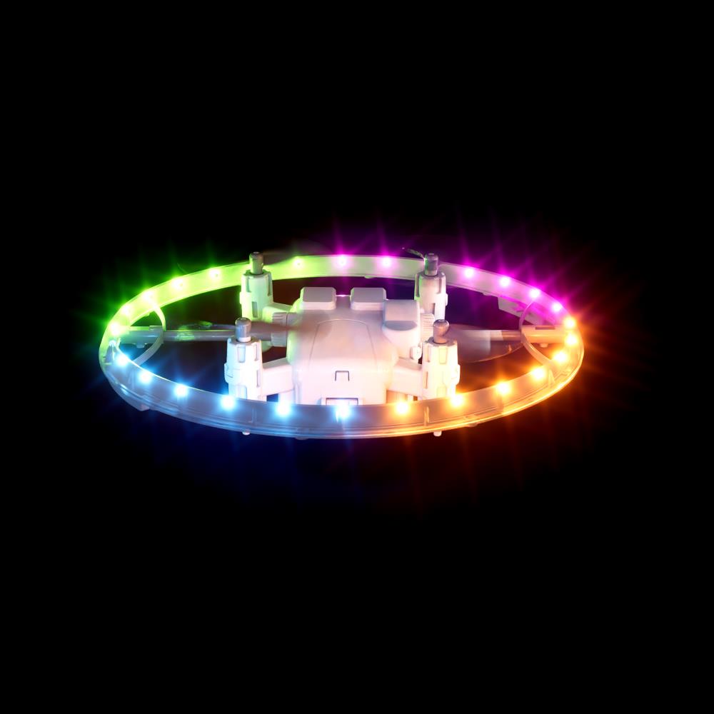 This is the remote controlled quadcopter drone that performs a light show in the sky. Encircling the unit and its four propellers is an LED-lined ring that can be directed to spin forward as well as side-to-side and produce a total of 10 multi-colored lighting patterns. The 75' range dual throttle remote control has a one-key take-off and landing button, 360° spin, speed controls, trim functions, and an auto-hover feature. Drone charges via USB; a full charge provides up to seven minutes of flight time. Remote requires three AAA batteries. Ages 12 and up. 5" L x 5" W x 1 1/3" H. (2 lbs.)