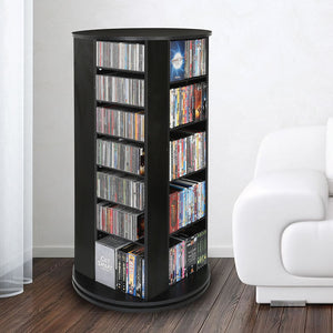 Created for Hammacher Schlemmer, this is the spinning media storage tower that holds over 1,000 CDs and up to 832 Blu-rays, 476 DVDs, or 280 VHS cassettes in less than 4' sq. of floor space. It occupies just a 26 1/2" diam. footprint and rotates 360° on 11 stainless steel ball bearings to provide convenient access on all four sides. Ideal for those with large CD or DVD collections, the rotating DVD storage tower has 28 adjustable 5 1/4" deep shelves that can be raised or lowered allowing you to create custom storage configurations. Constructed from engineered wood with a laminate finish, it’s balanced for smooth rotation and features an unobtrusive profile. Assembly required. Black. 50" H x 26 1/2" Diam. (49 3/4 lbs.)