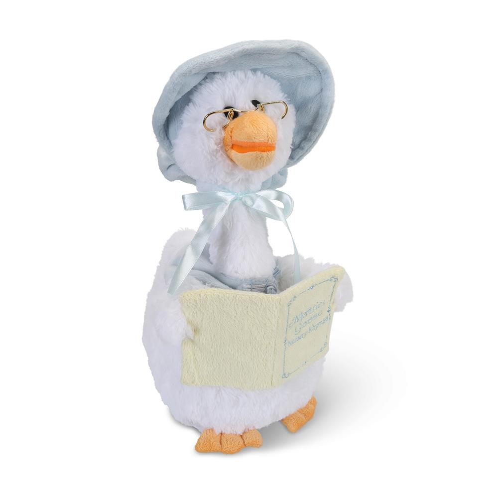 This is the animated mother goose that recites seven classic nursery rhymes with animated enthusiasm. A squeeze of her arm initiates the telling of Jack and Jill, Twinkle Twinkle Little Star, Humpty Dumpty, Hickory Dickory Doc, Little Miss Muffet, This Little Piggy, and Little Bo Peep. She speaks in a friendly, motherly voice while moving her beak and turning her head in synchronization with her words. Her 100% polyester exterior spot-cleans easily and is soft for bedtime cuddles. Includes three AA batteries. Ages 18 months and up. Select Blue or Pink. 14" H x 8" D x 6" W.