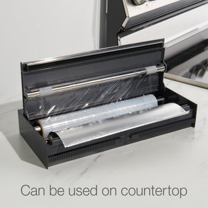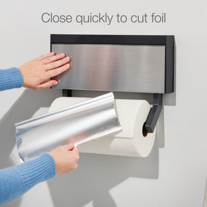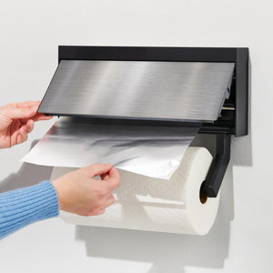 This is the four-in-one kitchen organizer that stores two rolls of cling wrap or aluminum foil. Made from ABS and stainless steel, it mounts to a wall, enabling easy dispensing of your preferred food wrap and can be set up to provide six utensil hooks or a paper towel dispenser. It fits two rolls up to 13 1/4" long and has a built-in ridge that allows for easy cutting. Cleans with a damp cloth. Mounts using included hardware. Can also be used on a countertop. 15" L x 6 1/2" W x 2 1/2" D. (2 lbs.)
