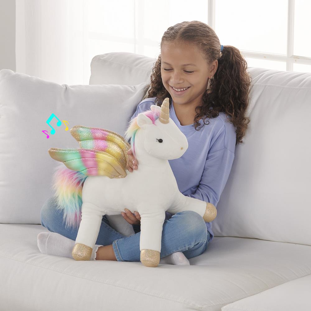 This is the plush unicorn that magically lights up and makes enchanted sounds when gently stroked. Petting the mythical beast’s back sets its wings aglow and causes a sparkly sound to emanate that you might hear from a magic wand. Designed by Gund, the company with a 120-year tradition of making plush toys, this fanciful foal has a multi-chromatic mane and tail that complement its glittery horn and shimmering wings. Its silky smooth coat and cuddly size create a faithful companion for a faerie femme that is soft and durable enough for an energetic hug. With an on/off switch. Includes three AAA batteries. Ages 3 and up. 16 1/2" H x 6 1/2" W x 14 3/4" L. (1 1/2 lbs.)