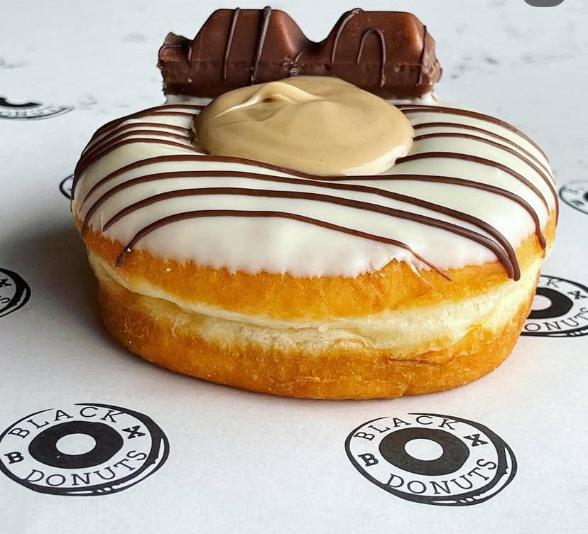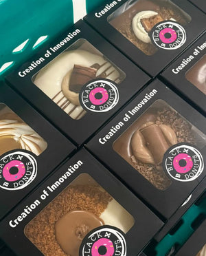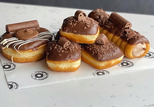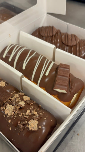 - 3 cream filled donollis - filled with cream. dipped in chocolate & topped with your favourite treats. Select from our milk chocolate trio - KitKat. Buttons & Kinder bar! Or white chocolate dream of - Biscoff. Bueno & Pistachio