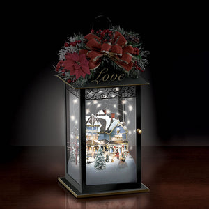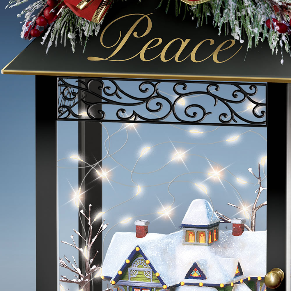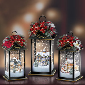 This is the set of decorative lanterns with holiday displays inspired by the artwork of Thomas Kinkade. Each piece contains a unique snow-frosted house sculpted from resin, meticulously hand-painted, and illuminated with a string of mini LEDs that create the illusion of a sparkling starry night inside each scene. The lanterns are handcrafted with burnished metal, topped with a poinsettia and pine arrangement, and each unique unit features the word “Peace”, “Love,” or “Joy.” Includes hand-numbered certificate of authenticity. Each lantern requires three AAA batteries. Peace lantern 10" H x 5" L x 5" W, Love lantern 8" H x 5" L x 5" W, Joy lantern 8" H x 5" L x 5" W.