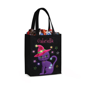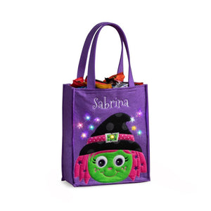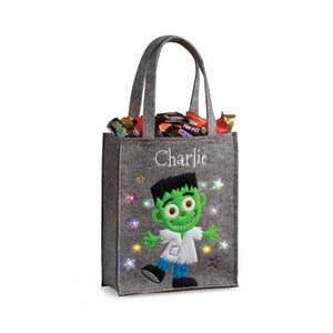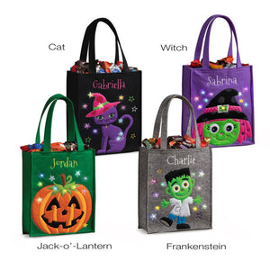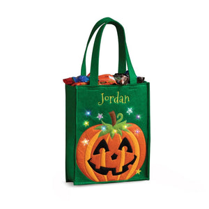 This is the illuminated Halloween tote that displays a trick-or-treater’s name with embroidered letters. Ideal for costume-clad children of all ages, the built-in LEDs cycle through multiple lighting effects, producing a constant display that lights up the night. With two thick handles and a fabric-lined frame that holds a child’s collection of candy after a successful night of trick-or-treating. Requires three AA batteries. Personalized with a name up to nine letters. Select Witch, Frankenstein, Jack-o’-Lantern, or Cat. 11 3/4" H x 10" W x 3 1/2" D.