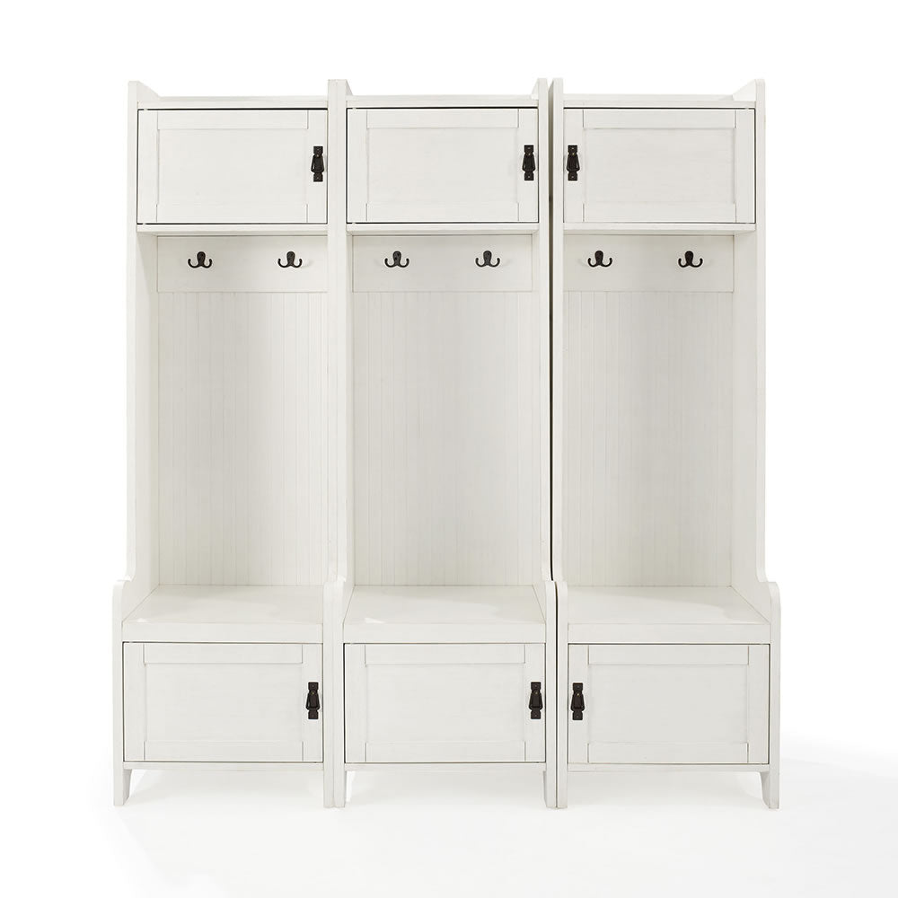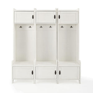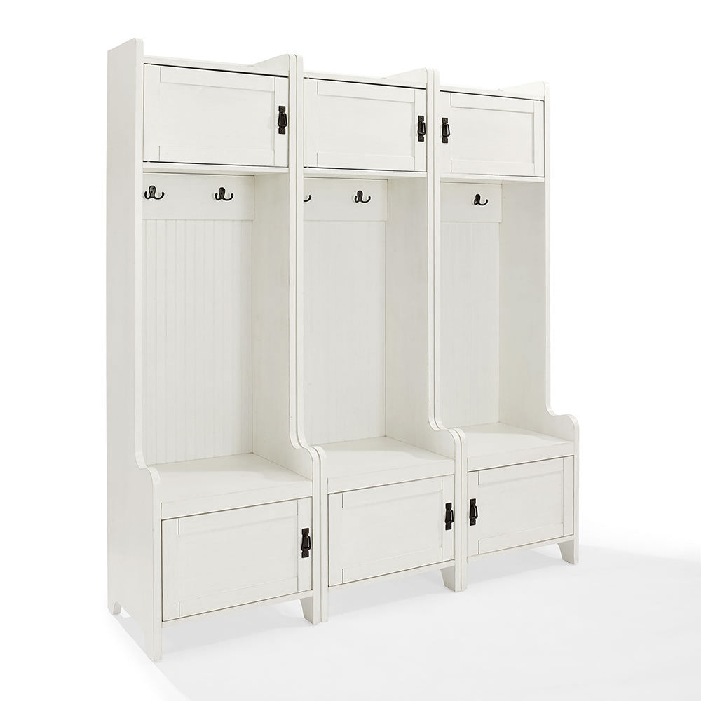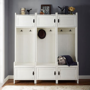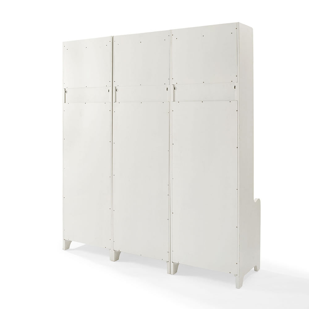 This is the set of three entryway coat towers that hold jackets, shoes, and other accessories. Each tower contains an upper storage compartment, two double hooks, and a bottom cupboard for stowing hats, gloves, and other outerwear. A bench-like seat supports up to 350 lbs. and provides a place to sit while suiting up or putting on shoes. Constructed of engineered wood. Assembly required. White. Each tower 74 1/4" H x 22 1/2" W x 18" D. (91 lbs.)