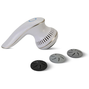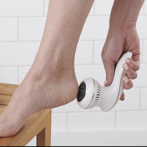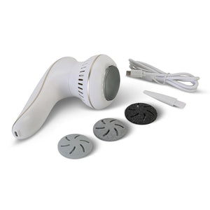 This is the powered pumice stone that removes dry, rough, and calloused skin on the feet and captures it via built-in suction. Its rotating head spins at two speeds (2,800 and 3,300 rpm), quickly and effectively buffing away hard, jagged skin on the sole and heel to leave feet softer and smoother. It can be held comfortably in one hand, producing salon-quality results with less time, effort, and mess than a standard pumice stone or metal foot file. Includes one 60 grit coarse exfoliating head, one 80 grit fine exfoliating head, and one 100 grit precision exfoliating head. Charges via USB.