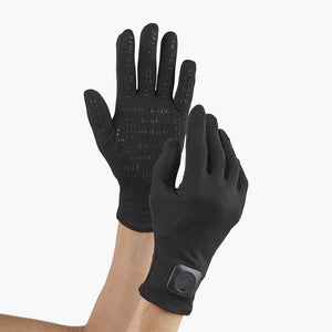 These are the therapeutic gloves that vibrate to help stimulate blood flow in the fingers and provide drug-free relief from pain and stiffness. Suitable for helping treat pain associated with arthritis, fibromyalgia, Parkinson’s disease, or other chronic conditions, the gloves have round nodes strategically placed over each finger and thumb joint that provide a gentle vibration to help massage away pain, reduce inflammation, and improve flexibility. With three levels of massage intensity. Recommended for 20- to 30-minute treatments, two times a day. Charges via USB; a full charge provides up to 40 minutes of power. Black. One Pair. Unisex sizes S, M, and L.