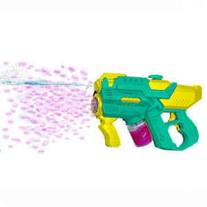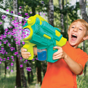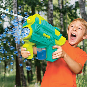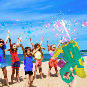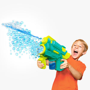 This is the two-in-one blaster that lets little ones attack friends and family with bubbles and squirts of water. Ideal for backyard battles over the last cookie or whose turn is next on the swing, it has two separate triggers—one that blows bubbles and one that blasts water. Its 12 bubble-making holes rotate to generate a nearly endless stream of bubbles without requiring one to dip wands or constantly refill solution. An integrated tank holds water, enabling children to aim at the bubbles, friends, or siblings. Includes six packs of bubble concentrate that make up to 85-90 ml of bubble solution (one pink, one blue, four clear). Bubble concentrate made in the USA. Charges via USB (with included cord). Ages 6 and up.